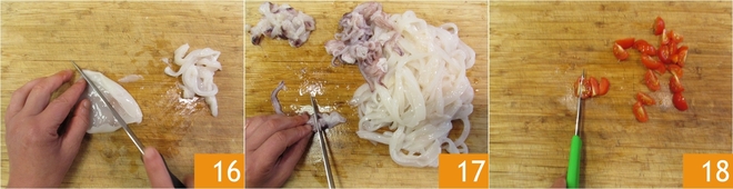 Stellen Sie sicher, dass die Tintenfische gut gereinigt sind, schneiden Sie die Mantel in Streifen 16 und die Tentakel in Stücke 17. Waschen Sie die Kirschtomaten und vierteln Sie sie 18. Stellen Sie einen Topf mit leicht gesalzenem Wasser auf den Herd, das für das Kochen der Pasta verwendet wird.