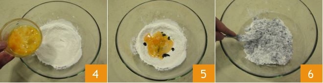 Nun zur Zubereitung der Pasta: Nehmen Sie eine große Schüssel und geben Sie das gesiebte Mehl hinein. Fügen Sie dem Mehl die Eier 4 und die Sepiatinte 5 hinzu. Helfen Sie sich zunächst mit einer Gabel 6, um den Teig gut zu vermischen.
