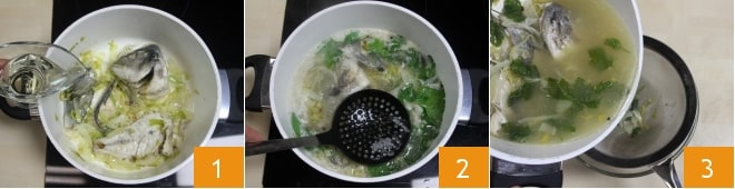 Um die Tagliolini mit doppelter Sepiatinte vorzubereiten, beginnen Sie mit der Zubereitung des Fischfonds. In einem Topf braten Sie in wenig Butter den in Ringe geschnittenen Lauch, die geviertelte Zwiebel und 1 Knoblauchzehe für 5 Minuten an. Nehmen Sie die Reste und fügen Sie sie hinzu, lassen Sie alles anbraten und geben Sie den Weißwein hinzu 1. Wenn der Wein vollständig verdampft ist, fügen Sie das Wasser, den Pfeffer und die Petersilie hinzu und schmecken Sie mit Salz ab. Lassen Sie es 60 Minuten bei niedriger Hitze kochen und schöpfen Sie gelegentlich den Schaum mit einem Schaumlöffel ab 2. Nach dem Kochen filtern Sie die Brühe mit einem feinen Sieb, um die Fischreste zu entfernen 3.