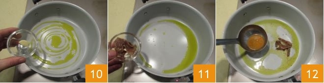 Gehen Sie dann zur Zubereitung der Soße über: Nehmen Sie eine Pfanne, geben Sie das Öl hinein und braten Sie eine ganze Knoblauchzehe an 10. Wenn sie gut gebräunt ist, entfernen Sie sie aus der Pfanne. Fügen Sie die Sardellen hinzu 11 und lassen Sie sie schmelzen, indem Sie etwas Fischfond hinzufügen 12.