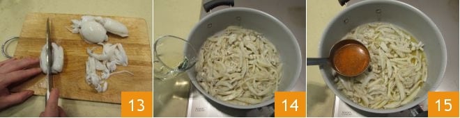Nehmen Sie jetzt Ihre Tintenfische (bereits gereinigt und gründlich unter fließendem Wasser gewaschen). Entfernen Sie die Tentakel, dann schneiden Sie sie in Scheiben 13. Geben Sie sie in die Pfanne und braten Sie sie einige Minuten bei starker Hitze an. Löschen Sie Ihre Tintenfische nun mit dem Weißwein ab 14. Schmecken Sie mit Salz und Pfeffer ab und benetzen Sie mit dem Fischfond 15.