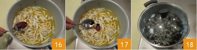 Fügen Sie den Tintenfischen auch das Tomatenmark 16 und die Sepiatinte 17 hinzu. Rühren Sie um, dann decken Sie die Pfanne mit einem Deckel ab und schalten Sie das Feuer aus 18.