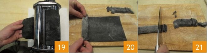 Jetzt widmen Sie sich der Zubereitung der Eierpasta mit Sepiatinte. Nehmen Sie den Teig, rollen Sie ihn mit der Nudelmaschine aus, beginnend mit der niedrigsten Stufe und fortschreitend bis zur höchsten, um einen sehr dünnen Teig zu erhalten, etwa 1 mm 19. Nehmen Sie die so erhaltenen Teigblätter und bestäuben Sie sie mit Hartweizengrieß (oder mit Mehl 00). Rollen Sie den Teig auf, indem Sie kleine Rollen formen 20, und schneiden Sie sie, wobei Sie eine Breite von etwa 2 mm beibehalten 21. So erhalten Sie Ihre Tagliolini.