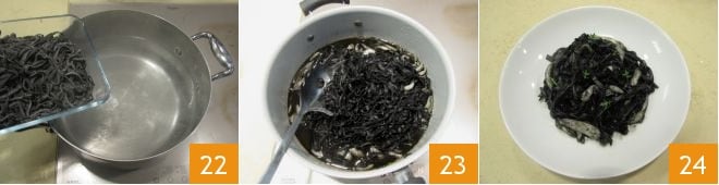Tauchen Sie Ihre Tagliolini mit Sepiatinte für wenige Sekunden in einen Topf mit reichlich gesalzenem Wasser nach Geschmack 22 und lassen Sie sie dann sofort abtropfen. Geben Sie die Tagliolini in die Soße, die Sie mit den Tintenfischen gekocht haben, und mischen Sie gut, damit die Tagliolini die Soße aufnehmen 23. Zum Schluss dekorieren Sie Ihre Tagliolini mit doppelter Sepiatinte mit einigen Thymianzweigen 24 und... genießen Sie!