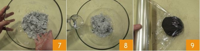 Wenn Eier und Sepiatinte in den Teig eingearbeitet sind, benutzen Sie Ihre Hände 7, um alle Zutaten zu vermischen. Fügen Sie Wasser bei Raumtemperatur hinzu, um den Teig besser zu homogenisieren 8. Kneten Sie gut, bis die Masse klumpenfrei ist. Formen Sie nun eine Kugel aus dem Teig und bedecken Sie sie mit Frischhaltefolie 9. Lassen Sie sie etwa eine halbe Stunde bei Raumtemperatur ruhen.