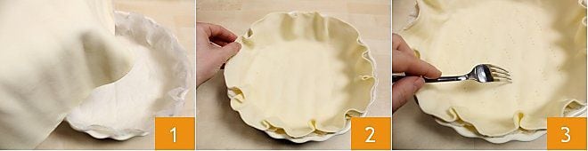 Um die Tarte mit Quark zuzubereiten, nehmen Sie eine Keramik- (oder Antihaft-)Kuchenform mit einem Durchmesser von 24 cm und legen Sie sie mit Backpapier aus, das Sie auf einen Durchmesser von 30 cm zuschneiden, gut anfeuchten und auswringen. Trocknen Sie das Papier, indem Sie es mit einem trockenen und sauberen Geschirrtuch abtupfen, und legen Sie es dann in die Kuchenform, sodass es gut haftet. Legen Sie den Blätterteig in die Kuchenform 1 und kleiden Sie die Form aus, indem Sie den Teig an den Seiten andrücken 2. Stechen Sie den Boden mit einer Gabel ein 3 und stellen Sie alles in den Kühlschrank.