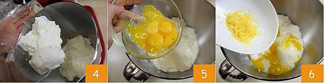 Kommen wir zur Füllung: In einer großen Schüssel den Fromage blanc 4, die Eigelbe 5 und die geriebene Schale einer unbehandelten Zitrone 6 geben.