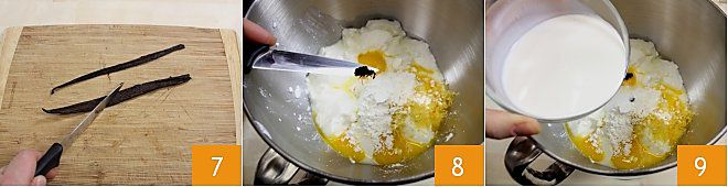Schneiden Sie die Vanilleschote der Länge nach auf und kratzen Sie die Samen mit der Messerspitze heraus 7, fügen Sie sie dann zu den anderen Zutaten hinzu 8. Am Ende fügen Sie in der Schüssel die Maisstärke, das Salz und die Sahne hinzu 9.