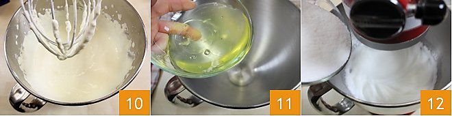Vermischen Sie alles mit den Quirlen eines elektrischen Mixers oder einer Küchenmaschine, bis Sie eine glatte und cremige Masse erhalten 10. Schlagen Sie separat das Eiweiß mit dem Zucker auf (11-12):