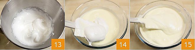 Das Eiweiß sollte glänzend sein, also nicht steif, sondern noch weich und cremig 13. Heben Sie es vorsichtig unter die Masse mit dem Fromage blanc 14, indem Sie von unten nach oben rühren 15.