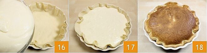 Gießen Sie alles in den Blätterteigboden und füllen Sie die Form zu 3/4 der Höhe (16-17) und backen Sie die Tarte mit Quark im statischen Ofen für etwa 1 Stunde bei 180°, bis die Oberfläche der Torte gut goldbraun ist 18. Nehmen Sie die Torte aus dem Ofen und lassen Sie sie auf einem Rost abkühlen: Ihre Tarte mit Quark kann warm oder kalt serviert werden!