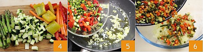 In der Zwischenzeit putzen und schneiden Sie das Gemüse 4 (Karotten, Spargel, Zucchini, Paprika) in kleine Würfel, dann fügen Sie es der Frühlingszwiebel hinzu und lassen Sie es bei niedriger Hitze anbraten, bis es weich wird 5. Nach dem Garen mit Salz abschmecken, abkühlen lassen und zu den Kartoffeln geben 6.