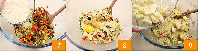 Fügen Sie den geriebenen Grana Padano DOP 7, etwas beiseite lassen, um es am Ende hinzuzufügen, die Eier 8, den in Würfel geschnittenen Mozzarella 9, eine Prise Salz und eine Prise Pfeffer hinzu,