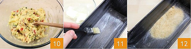dann alles gut vermischen 10. Butter Sie eine Kastenform von 27x10 cm 11 und bestäuben Sie sie mit Paniermehl 12;