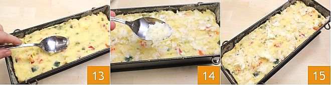 Füllen Sie die Kartoffelmischung in die Form, glätten Sie sie mit einem Löffel 13 und bestreuen Sie sie mit dem beiseite gehaltenen geriebenen Käse 14. Backen Sie in einem statischen Ofen für 50 Minuten bei 180° 15. Sobald es fertig ist, stürzen Sie die Terrine Millegeschmack und servieren Sie sie noch warm.