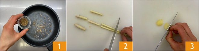 Um das thailändische grüne Curry zuzubereiten, geben Sie zuerst die Koriandersamen, die Kreuzkümmelsamen 1 in eine Pfanne und rösten sie für ein paar Minuten. Schneiden Sie das Zitronengras in Stücke 2 und den Ingwer in Scheiben 3.