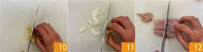 Hacke den Ingwer 10 mit dem Messer, schneide die Zwiebel in Scheiben 11 und schneide die Hähnchenbrust in 3 cm lange und 1 cm dicke Stücke 12.