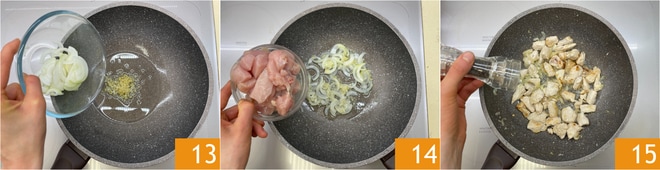Erhitzen Sie in einer geräumigen Pfanne das Sonnenblumenöl, fügen Sie den gehackten Ingwer und die Zwiebel hinzu 13, und braten Sie es für ein paar Minuten an. Wenn die Zwiebel transparent geworden ist, fügen Sie die Hähnchenstücke hinzu 14 und braten Sie sie an, bis sie goldbraun sind. Mit Salz und Pfeffer abschmecken 15.