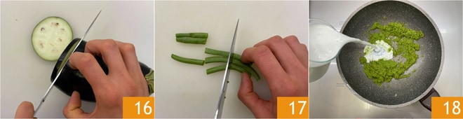 In der Zwischenzeit schneiden Sie die Aubergine in 0,5 cm dicke Scheiben 16, kürzen Sie die Bohnen und schneiden Sie sie in zwei Hälften 17. Nehmen Sie das Huhn aus der Pfanne und stellen Sie es beiseite. Geben Sie in dieselbe Pfanne die grüne Currypaste, braten Sie sie für ein paar Minuten an und löschen Sie dann mit Kokosmilch ab 18.