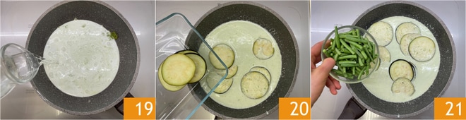 Fügen Sie das Wasser 19, die Auberginen 20 und die Bohnen 21 hinzu.