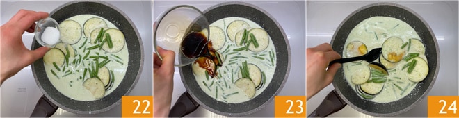 Fügen Sie den Zucker 22, die Sojasauce 23 hinzu und kochen Sie für etwa 15-20 Minuten oder bis das Gemüse gar ist 24.