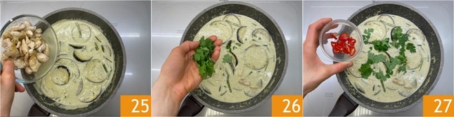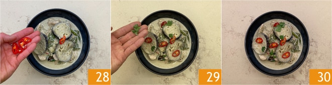 Richten Sie an und beenden Sie mit Chili 28 und frischem Koriander 29. Ihr thailändisches grünes Curry ist servierfertig 30