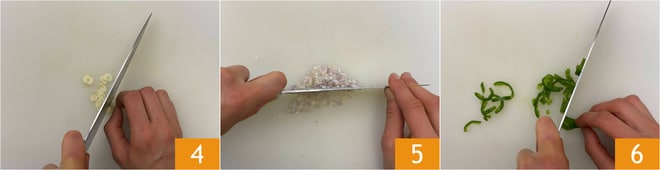 Hacke den Knoblauch 4 und die Schalotte 5 mit einem Messer. Entfernen Sie die Samen und die inneren Stränge des Chilis und schneiden Sie ihn fein 6.