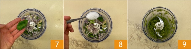 Geben Sie alle Zutaten in einen Mixer, fügen Sie ein paar Blätter Kaffir-Limette 7, einen Teelöffel Salz 8 hinzu und pürieren Sie, bis eine homogene Paste entsteht 9.