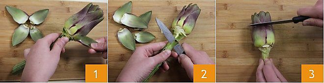 Um die kleinen Sepien mit Artischocken zuzubereiten, beginnen Sie mit der Reinigung der Artischocken, entfernen Sie die äußeren harten Blätter 1, dann entfernen Sie auch den äußeren Teil des Stiels und schneiden Sie ihn einige Zentimeter unterhalb der Basis der Artischocke ab 2, entfernen Sie auch die Spitzen, sodass nur das Herz übrig bleibt 3