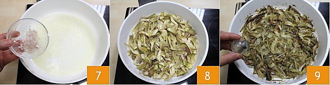 In einem Topf schmelzen Sie die Butter und fügen die fein gehackte Schalotte hinzu 7, lassen Sie sie 10 Minuten lang anschwitzen; wenn sie angeschwitzt ist, fügen Sie die Artischocken hinzu 8, braten Sie sie gut an, salzen und pfeffern Sie nach Geschmack 9.