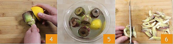 Sobald Sie die Reinigung einer Artischocke beendet haben, um zu vermeiden, dass sie sich verfärbt, reiben Sie sie mit der Hälfte einer Zitrone ein und legen Sie sie dann in eine Schüssel mit säuerlichem Wasser (4-5), so können Sie die Reinigung aller Artischocken fortsetzen, ohne dass sie sich verfärben. Nach dem Reinigen der Artischocken, lassen Sie sie gut abtropfen, schneiden Sie sie in Hälften, entfernen Sie das innere Haar und schneiden Sie sie in dünne Spalten 6.