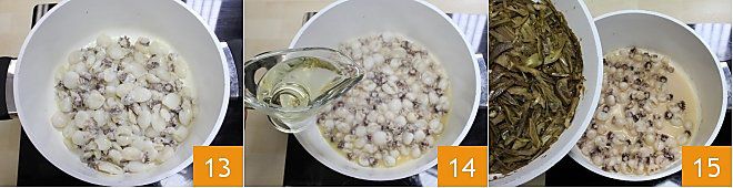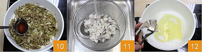 Geben Sie eine Kelle Brühe hinzu 10 und lassen Sie sie kochen, bis sie weich werden, dann schalten Sie das Feuer aus und stellen Sie die Artischocken beiseite. In der Zwischenzeit waschen Sie die kleinen Sepien unter fließendem Wasser und lassen Sie sie gut abtropfen 11. Dann geben Sie in einem anderen großen Topf das Öl und den zerdrückten Knoblauch (wenn Sie ihn später entfernen möchten, legen Sie ihn ganz hinein) 12,