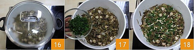 Lassen Sie sie auf niedriger Flamme weiterkochen, mit einem Deckel abgedeckt, bis die kleinen Sepien zart werden 16, falls nötig, fügen Sie eine Kelle Brühe hinzu, um zu verhindern, dass alles trocken wird. Fünf Minuten bevor Sie das Feuer ausschalten, fügen Sie den gehackten Thymian und die Petersilie hinzu 17, mischen Sie gut durch, dann fügen Sie auch die Pinienkerne hinzu 18 und schmecken mit Salz und Pfeffer ab. Ihre kleinen Sepien mit Artischocken sind bereit, genossen zu werden, servieren Sie sie heiß!