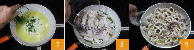 fügen Sie die Mischung aus Schalotte, Petersilie und Knoblauch hinzu 7, lassen Sie sie für ein paar Sekunden anbraten, dann geben Sie die Tintenfische hinzu 8 und lassen Sie sie fünf Minuten bei mittlerer Hitze anbraten. Nach fünf Minuten mit Weißwein ablöschen 9, verdampfen lassen,