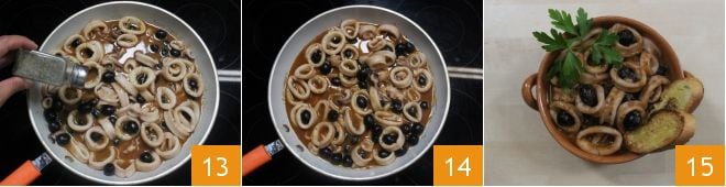 und Pfeffer 13 um die Zubereitung abzuschließen. Eure Tintenfische mit Oliven sind fertig 14, serviert sie mit gerösteten Brotscheiben und genießt sie gut heiß 15.