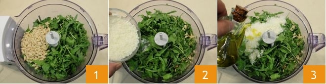 Bereiten Sie in der Zwischenzeit das Pesto vor: Waschen und trocknen Sie die Rucola gut ab und geben Sie sie in einen Mixer. Fügen Sie die Pinienkerne 1, das Salz, den Knoblauch, den Grana Padano DOP 2 und die Hälfte der Olivenölmenge 3 hinzu.