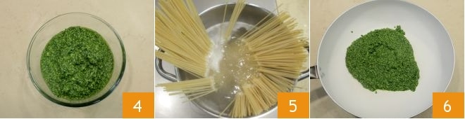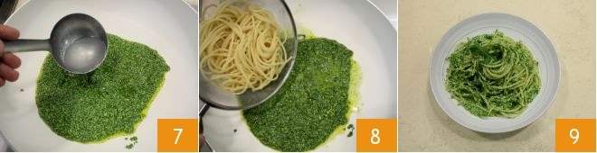 Wenn die Nudeln al dente sind, mischen Sie das Pesto, bevor Sie sie abseihen, mit einer Schöpfkelle Kochwasser 7. Lassen Sie die Nudeln abtropfen und schwenken Sie sie für einen Moment im Raukenpesto bei starker Hitze 8.