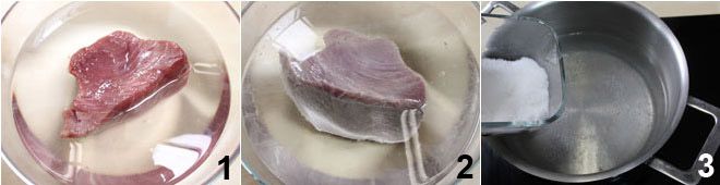Um den in Öl eingelegten Thunfisch zuzubereiten, beginnen Sie damit, das rohe Stück in eine Schüssel mit kaltem Wasser zu legen, spülen Sie es mehrmals ab, damit es all das Blut verliert, um zu verhindern, dass es während des Kochens gerinnt und unästhetische dunkle Klumpen bildet 1. Wiederholen Sie den Vorgang, indem Sie das Wasser wechseln, bis es klar ist und der Thunfisch vollständig blutfrei ist 2. Bringen Sie in einem anderen Topf Wasser mit Salz zum Kochen 3 und,