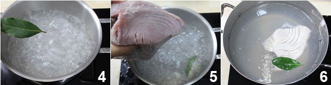 wenn es kocht, fügen Sie nach Belieben ein paar Lorbeerblätter hinzu. 4 Das Salz und der Lorbeer geben dem Thunfisch Geschmack, der sonst fade bleiben würde. Zu diesem Zeitpunkt fügen Sie den Thunfisch hinzu 5 und lassen Sie ihn etwa 1 Stunde bei mittlerer Hitze kochen 6.