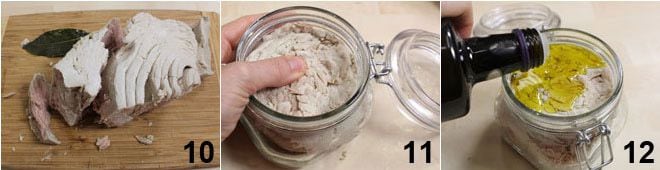 Zerbröckeln Sie den Thunfisch grob 10 und legen Sie ihn in die Gläser, drücken Sie ihn gut mit den Händen 11. Bedecken Sie ihn mit nativem Olivenöl extra und achten Sie darauf, den Thunfisch vollständig zu bedecken, aber 1 Zentimeter Abstand zum Rand des Glases zu lassen 12 und,