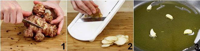 Um Topinambur in der Pfanne zuzubereiten, beginnen Sie mit der Reinigung der Topinambur-Knollen. Reiben Sie zuerst Ihre Hände mit Zitronensaft ein, da Topinambur, wie Artischocken, dazu neigen, sich zu verfärben und dunkle Fingerkuppen zu hinterlassen. Bereiten Sie auch eine Schüssel mit säuerlichem Wasser (mit Zitronensaft) vor, um sie nach dem Reinigen einzutauchen. Schaben Sie mit einem kleinen Messer die Schale der Topinambur ab, um Schmutz und härtere Stellen zu entfernen 1. Waschen Sie sie gut und tauchen Sie sie in das säuerliche Wasser ein, um eine Verfärbung zu vermeiden. Lassen Sie die Topinambur abtropfen und spülen Sie sie ab, schneiden Sie sie in etwa 2/3 mm dünne Scheiben, mithilfe eines scharfen Messers oder einer Mandoline 2, und bereiten Sie eine Antihaftpfanne vor, in der Sie das Olivenöl extra vergine erhitzen und die in Stücke geschnittenen Knoblauchzehen anbräunen lassen 3.