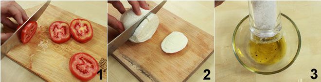 Schneiden Sie die Tomaten in Scheiben 1 und die Mozzarella in Scheiben. Teilen Sie jede Mozzarellascheibe nochmals in 4 Teile, sodass diese die gleiche Größe wie die Tomatenscheiben haben 2. In einer kleinen Schüssel das Öl gut mit Salz und Pfeffer vermischen 3.