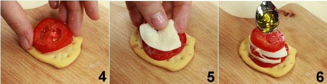 Legen Sie nun auf die Schiacciate „La Bottega di Olivia&Marino“ eine Tomatenscheibe 4, dann eine Scheibe Mozzarella 5 und wiederholen Sie den Vorgang noch einmal; schließen Sie alles mit einer Tomatenscheibe ab. Dann beträufeln Sie jede Turm mit einem Schuss Öl 6. Befestigen Sie den Turm mit einem Zahnstocher oder einem kleinen Holzspieß und dekorieren Sie ihn oben mit zwei Basilikumblättern.