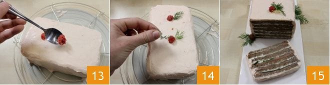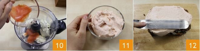 Bereiten Sie nun die Creme zum Überziehen vor: Nehmen Sie 300 g Frischkäse und pürieren Sie sie zusammen mit dem Lachs 10 und einem Esslöffel Milch, bis Sie eine sehr glatte Creme erhalten 11, die Sie mindestens 30 Minuten im Kühlschrank ruhen lassen, um sie leichter streichen zu können. Nach dieser Zeit streichen Sie die Creme auf die Oberfläche des Brotes und die Seiten, um den gesamten Kuchen 12 mit einer speziellen Spachtel oder einem glatten Messer zu bedecken. Sobald es vollständig bedeckt ist, stellen Sie es für mindestens eine Stunde in den Kühlschrank, um es fest werden zu lassen.