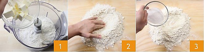 Um den San Biagio Kuchen zuzubereiten, beginnen Sie mit der Herstellung des Mürbeteigs: Mixen Sie die kalte Butter mit dem Mehl in einem Mixer, bis Sie eine sandige Konsistenz erhalten 1. Übertragen Sie die Mischung auf die Arbeitsfläche, formen Sie sie zu einem klassischen Brunnen 2 und fügen Sie den Zucker hinzu 3.