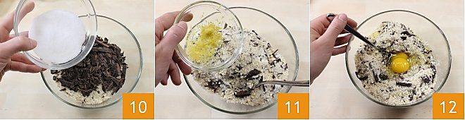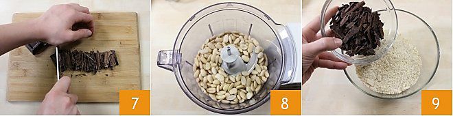 Zerhacken Sie in der Zwischenzeit die dunkle Schokolade fein 7 und mahlen Sie die Mandeln in einem Mixer 8. Mischen Sie in einer großen Schüssel die beiden Zutaten 9 und