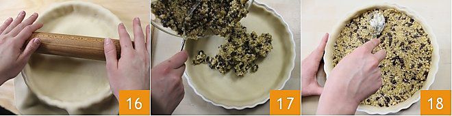 Vermischen Sie die Zutaten gut mit einem Löffel 13. Rollen Sie nun den Mürbeteig mit Hilfe eines Nudelholzes auf eine Dicke von einem halben cm aus 14 und bedecken Sie damit eine gut gebutterte und bemehlte Backform mit einem Durchmesser von 27 cm 15.