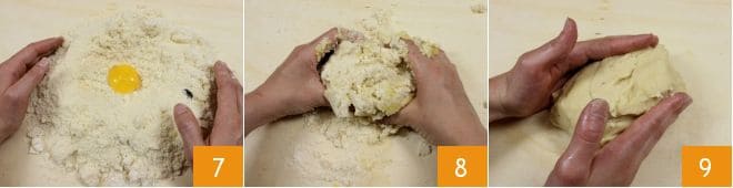 Formen Sie einen klassischen Brunnen und gießen Sie das Eigelb in die Mitte 7; kneten Sie alles kurz mit der Hand 8, bis Sie einen glatten und homogenen Teig haben 9, und formen Sie ihn zu einem Block.