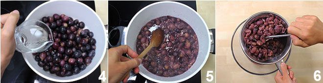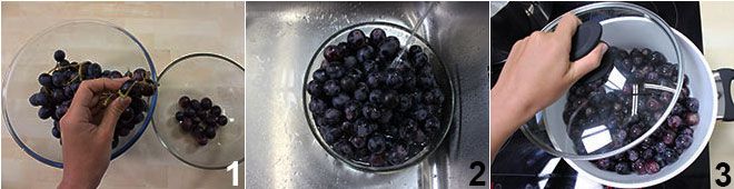 Um die Traubensugoli zuzubereiten, beginnen Sie damit, die Trauben zu entstielen 1, dann waschen Sie sie gründlich unter fließendem Wasser 2. Geben Sie die Traubenbeeren in einen großen Topf, decken Sie ihn mit einem Deckel ab 3 und kochen Sie sie bei schwacher Hitze für 2-3 Minuten.