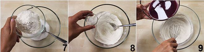 Vermischen Sie nun in einer Schüssel Zucker und Mehl 7 und fügen Sie die Samen der Vanilleschote (oder Vanillin) hinzu 8. Fügen Sie nach und nach den zuvor gewonnenen Traubensaft zu den trockenen Zutaten hinzu 9,